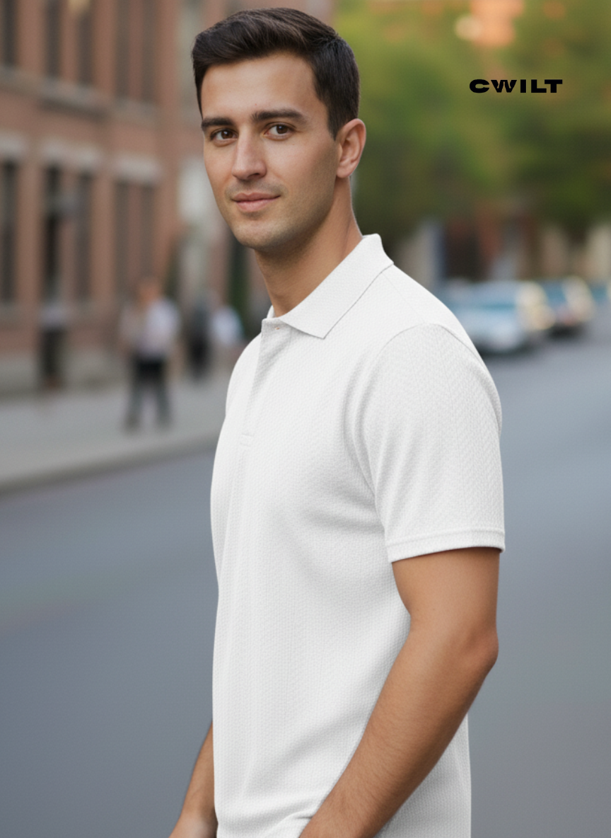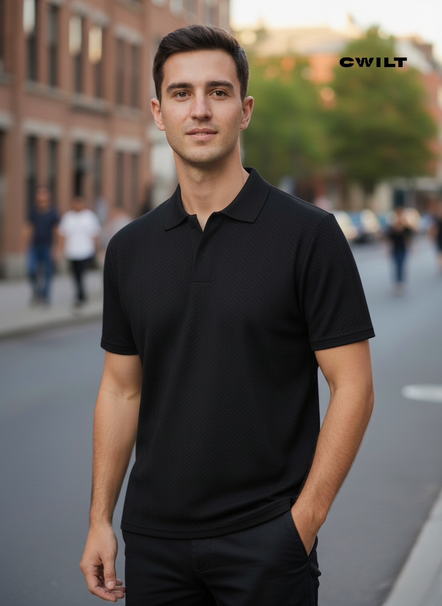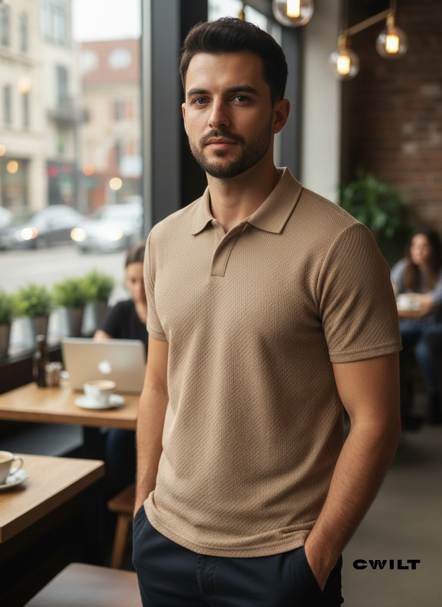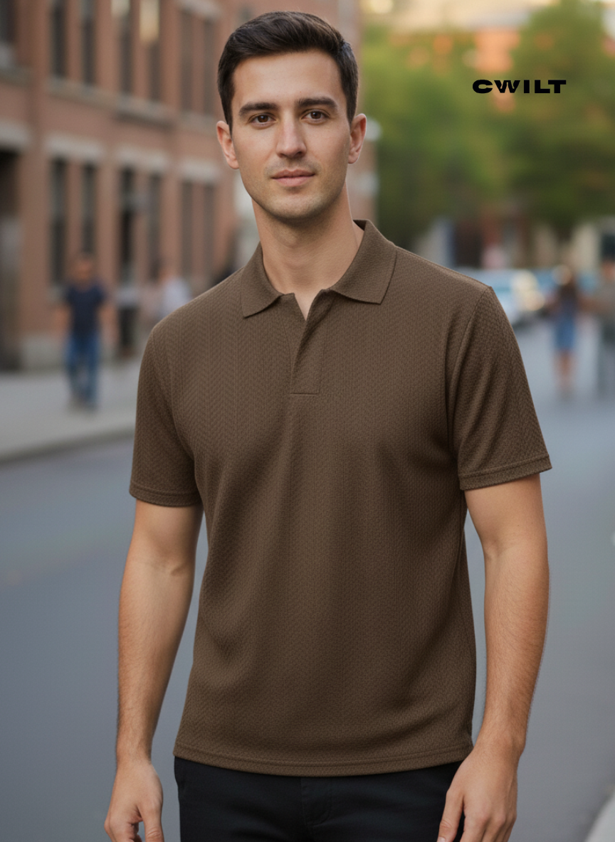 CHOMBA TEJIDA TEXTURADA, CORTE CLASICO.